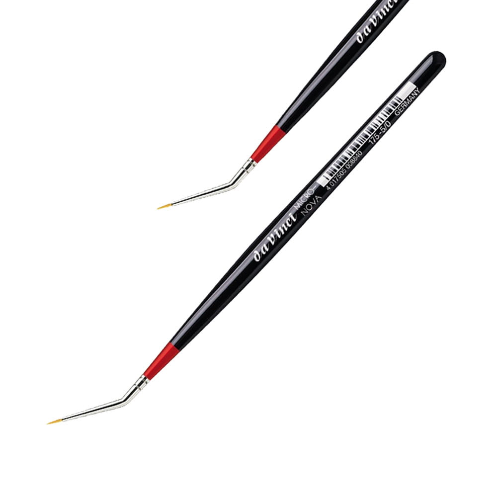 Pędzle marki da Vinci serii 175 Micro-Nova to precyzyjne pędzle kątowe z włosiem syntetycznym. Ich przeznaczenie sprawdzi się do farb akwarelowych, akrylowych, jak i również gwaszy. Seria pędzli posiada lakierowaną krótką rączkę, która została pomalowana na czarno z dodatkiem czerwieni, bezszwową niklowaną srebrną skuwkę oraz syntetyczne włosie w pomarańczowym odcieniu. Dzięki zagiętej skuwce praca nad detalami jest jeszcze bardziej precyzyjna i łatwiejsza. Pędzle serii 175 sprawdzą się do malowania modeli i figurek. Trzonek pędzla został tak wyważony, aby wygodnie układał się w dłoni, przez co ma się stałą kontrolę nad prowadzoną linią. Pędzle występują w dwóch rozmiarach: 5/0, 15/0.