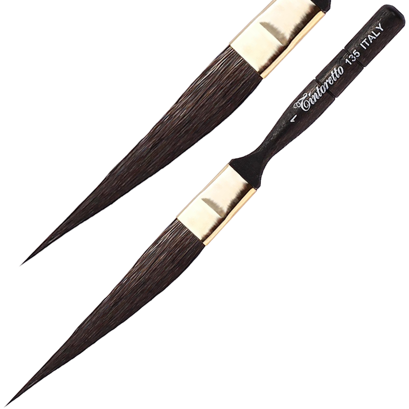 Są wyposażone w bardzo krótki uchwyt, który maksymalnie zwiększa kontrolę nad ruchami pędzla. Okucie z pozłacanego mosiądzu.