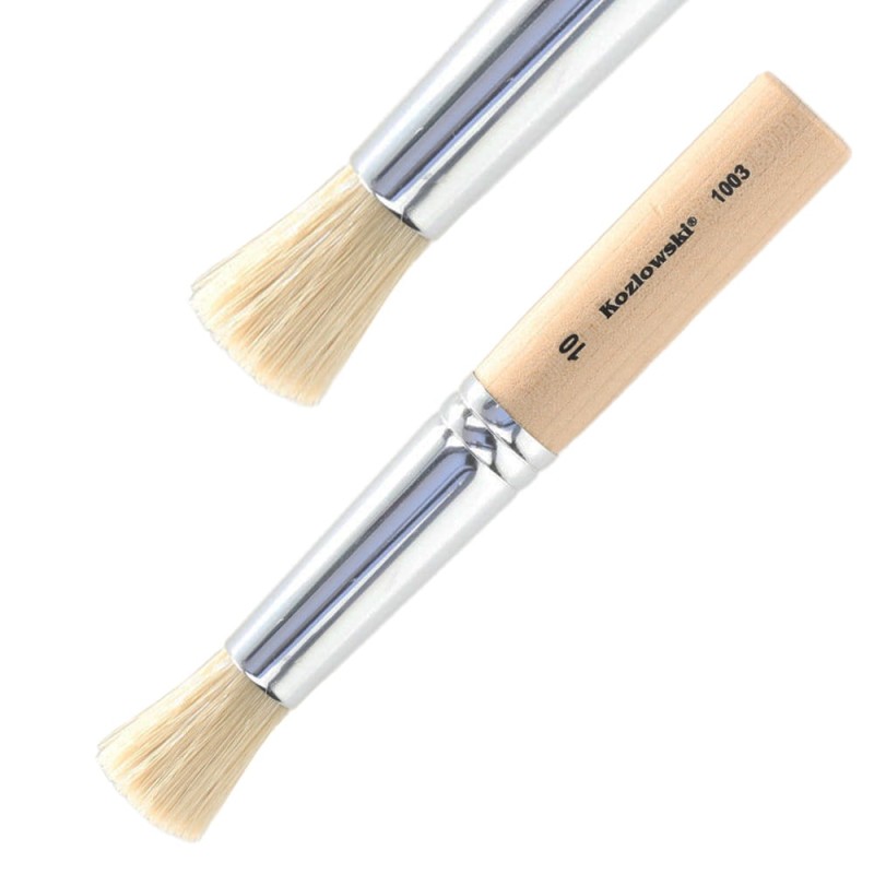 Pędzel przeznaczony do techniki tapowania, charakteryzujący się ściętym na płasko włosiem z białej szczeciny w ocynkowanej skuwce oraz bardzo krótkim trzonkiem z surowego drewna. Tapowanie polega na delikatnym uderzaniu pędzlem o szablon pod kątem prostym do malowanej powierzchni.