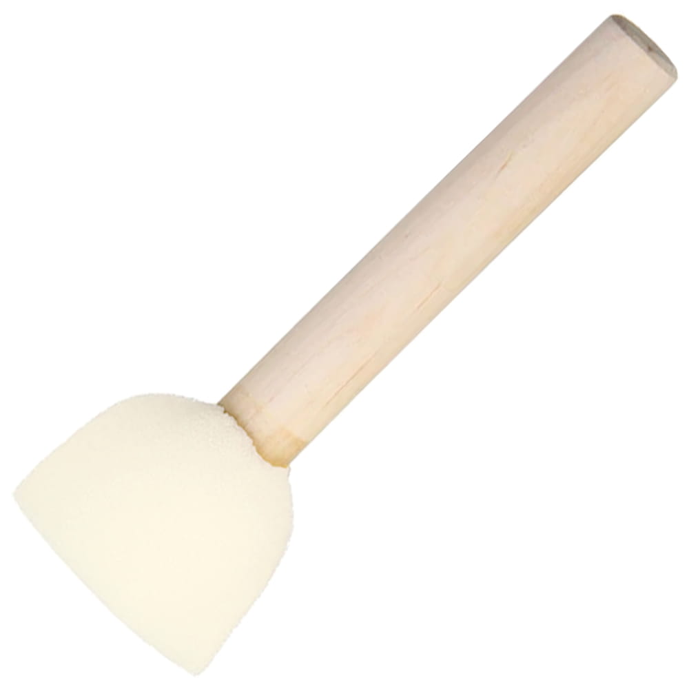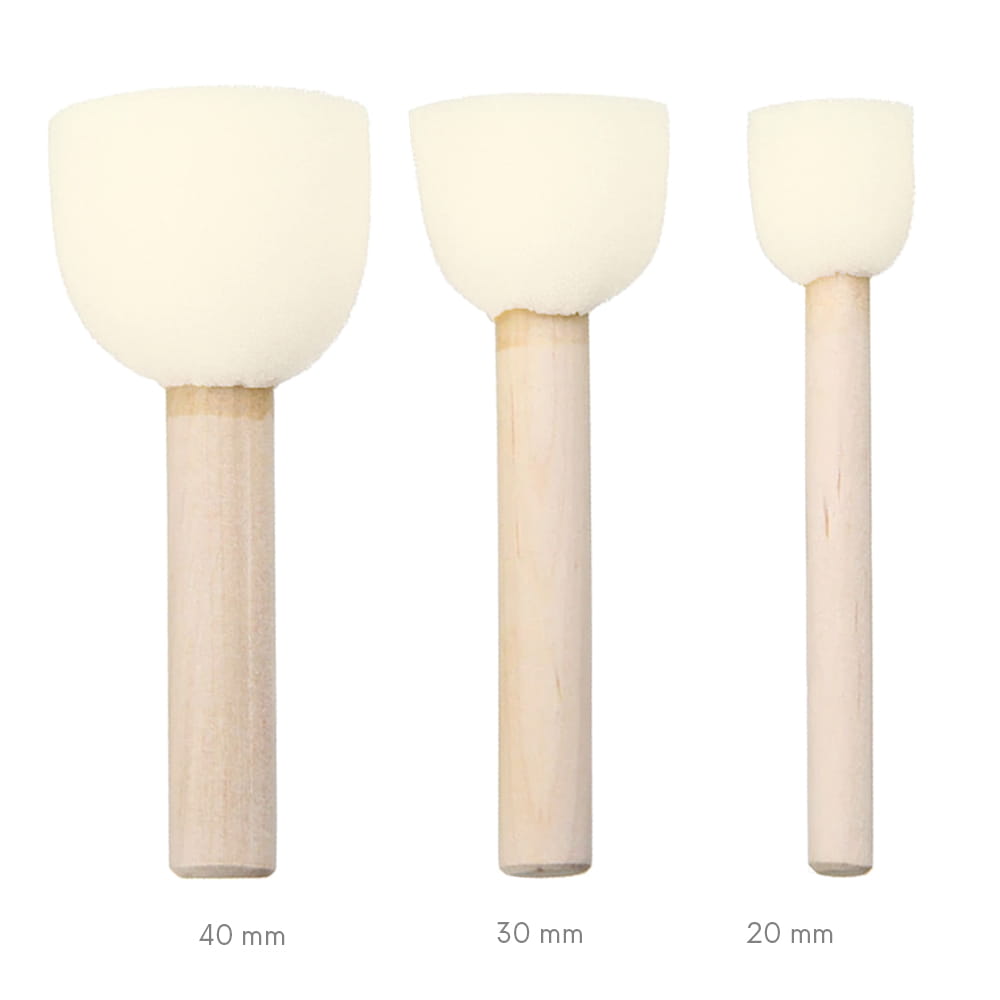 Okrągły pędzel gąbkowy o średnicy 3 cm. Pędzel gąbkowy z drewnianym uchwytem to doskonały aplikator do nakładania farby metodą topowania, polegającą na delikatnym przykładaniu gąbki płasko ściętą stroną. Pozwala na równomierne pokrycie powierzchni farbą bez konieczności brudzenia rąk i umożliwia lepszą kontrolę nacisku gąbki. Doskonałe narzędzie do pracy z szablonami i techniki decupage. Pędzel pozostawia charakterystyczną dla gąbki strukturę, pozwala na równomierne pokrycie powierzchni farbą.