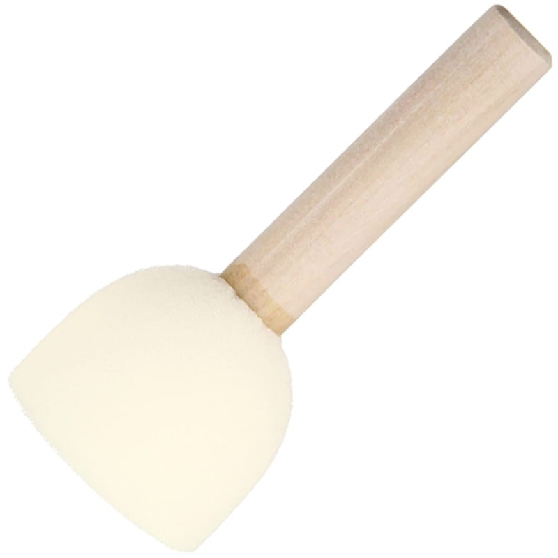 Okrągły pędzel gąbkowy o średnicy 4 cm. Pędzel gąbkowy z drewnianym uchwytem to doskonały aplikator do nakładania farby metodą topowania, polegającą na delikatnym przykładaniu gąbki płasko ściętą stroną. Pozwala na równomierne pokrycie powierzchni farbą bez konieczności brudzenia rąk i umożliwia lepszą kontrolę nacisku gąbki. Doskonałe narzędzie do pracy z szablonami i techniki decupage. Pędzel pozostawia charakterystyczną dla gąbki strukturę, pozwala na równomierne pokrycie powierzchni farbą.