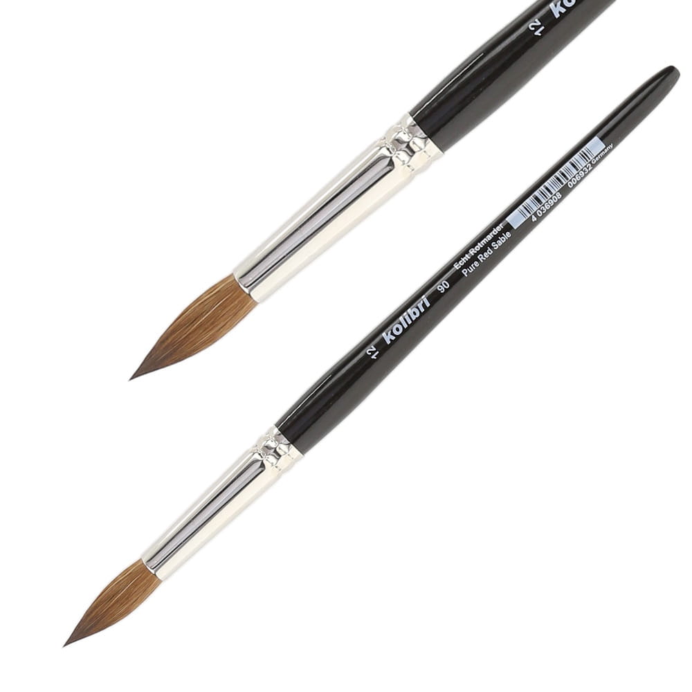 Kolibri seria 90 to okrągłe pędzle z naturalnym włosiem czerwonego sobola, którego używa się w malarstwie akwarelowym. Wysokiej jakości włosie osadzone jest na czarnej, krótkiej, politurowanej rączce za pomocą mosiężnej, bezszwowej i niklowanej skuwki. Angielska tabela rozmiarów.