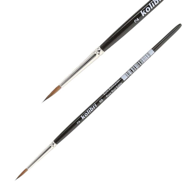 Kolibri seria 90 to okrągłe pędzle z naturalnym włosiem czerwonego sobola, którego używa się w malarstwie akwarelowym. Wysokiej jakości włosie osadzone jest na czarnej, krótkiej, politurowanej rączce za pomocą mosiężnej, bezszwowej i niklowanej skuwki. Angielska tabela rozmiarów.