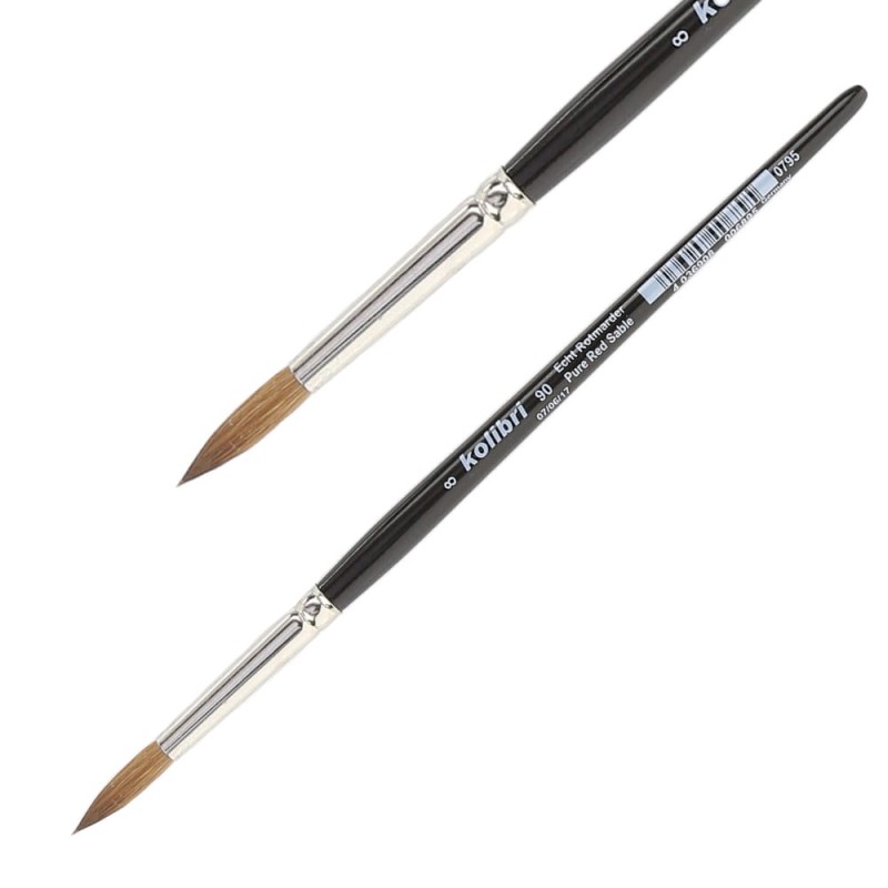Kolibri seria 90 to okrągłe pędzle z naturalnym włosiem czerwonego sobola, którego używa się w malarstwie akwarelowym. Wysokiej jakości włosie osadzone jest na czarnej, krótkiej, politurowanej rączce za pomocą mosiężnej, bezszwowej i niklowanej skuwki. Angielska tabela rozmiarów.