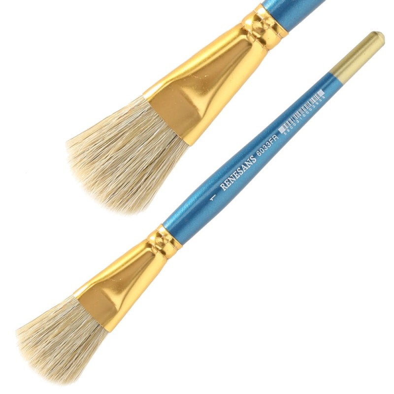 Renesans 6033FR to seria płaskich pędzli z końcówką zaokrągloną w tzw koci język. Szczecinowe włosie jest bardzo sprężyste, elastyczne i wytrzymałe. Zakończone krotką, lakierowaną rączką w kolorze niebieskim. Pędzle idealnie sprawdzą się do oleju i akrylu.