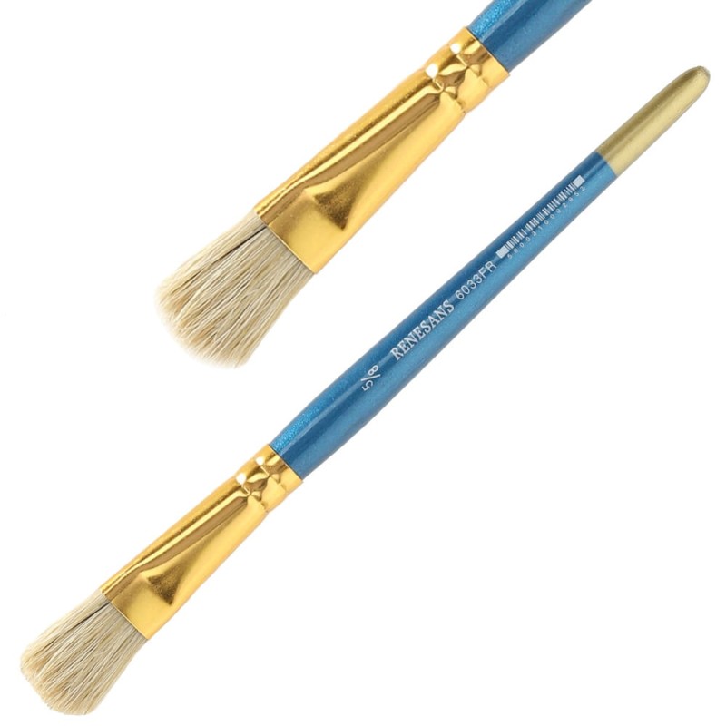 Renesans 6033FR to seria płaskich pędzli z końcówką zaokrągloną w tzw koci język. Szczecinowe włosie jest bardzo sprężyste, elastyczne i wytrzymałe. Zakończone krotką, lakierowaną rączką w kolorze niebieskim. Pędzle idealnie sprawdzą się do oleju i akrylu.
