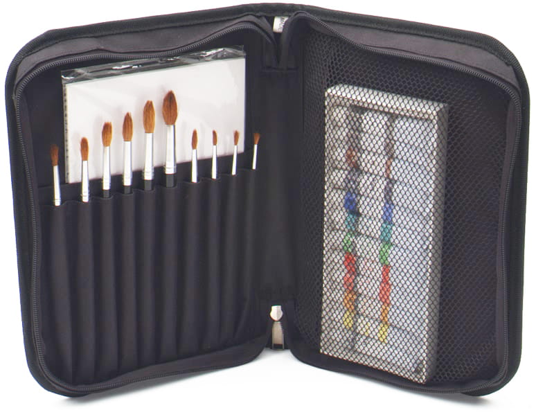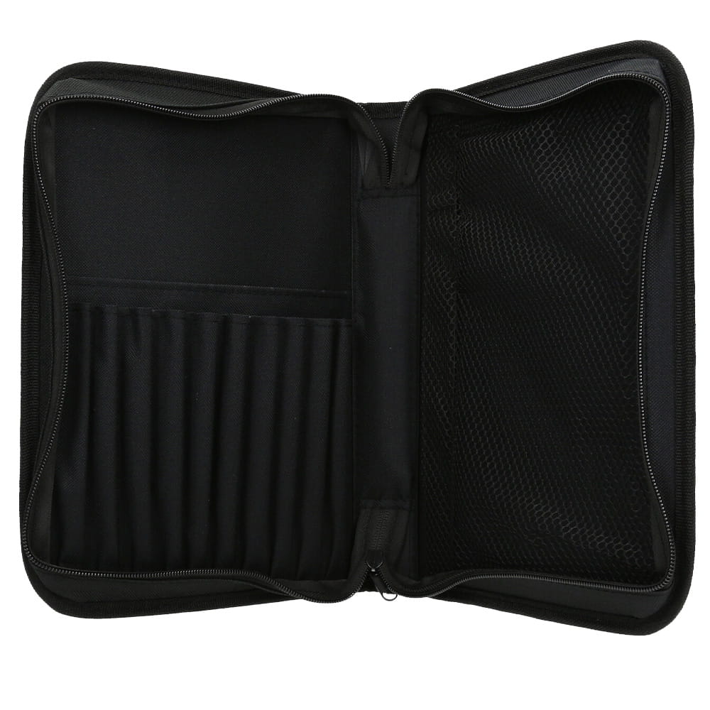 Piórnik malarski 18x28 cm. Wykonany z materiału syntetycznego, który jest dodatkowo usztywniany. Piórnik posiada miejsca na 10 pędzli, miejsce na kartki oraz specjalną kieszonkę wyposażoną w zabezpieczającą siatkę, do której można wrzucić wiele przydatnych materiałów plastycznych. Całość zapinana na zamek błyskawiczny.