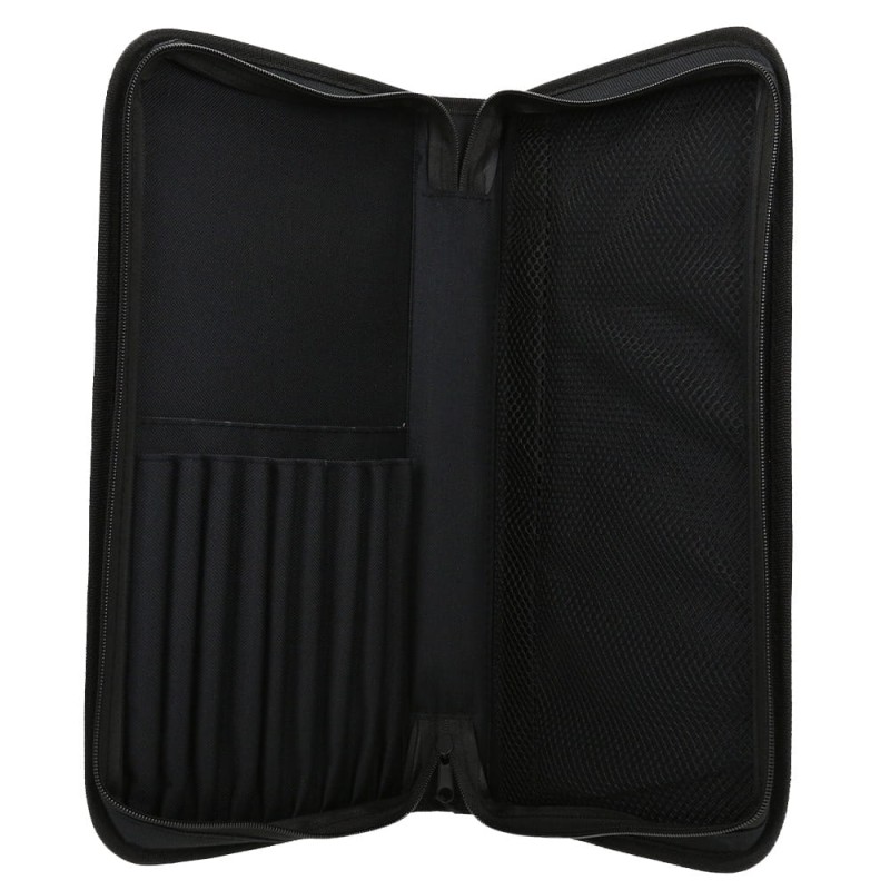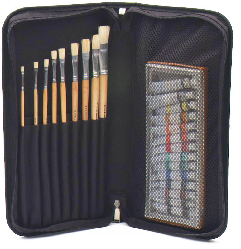 Piórnik malarski 19x39 cm. Wykonany z materiału syntetycznego, który jest dodatkowo usztywniany. Piórnik posiada miejsca na 9 pędzli, miejsce na kartki oraz specjalną kieszonkę wyposażoną w zabezpieczającą siatkę, do której można wrzucić wiele przydatnych materiałów plastycznych. Całość zapinana na zamek błyskawiczny.