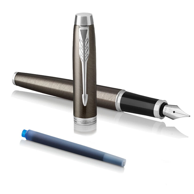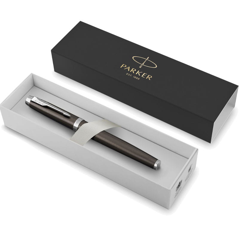 Wieczne pióro IM firmy Parker to klasyczne, proste, eleganckie pióro składające się z mosiężnego pokrytym lakierem w kolorze ciemnego espresso z chromowanymi elementami ozdobnymi. Stalówka wykonana ze stali nierdzewnej o grubości F.