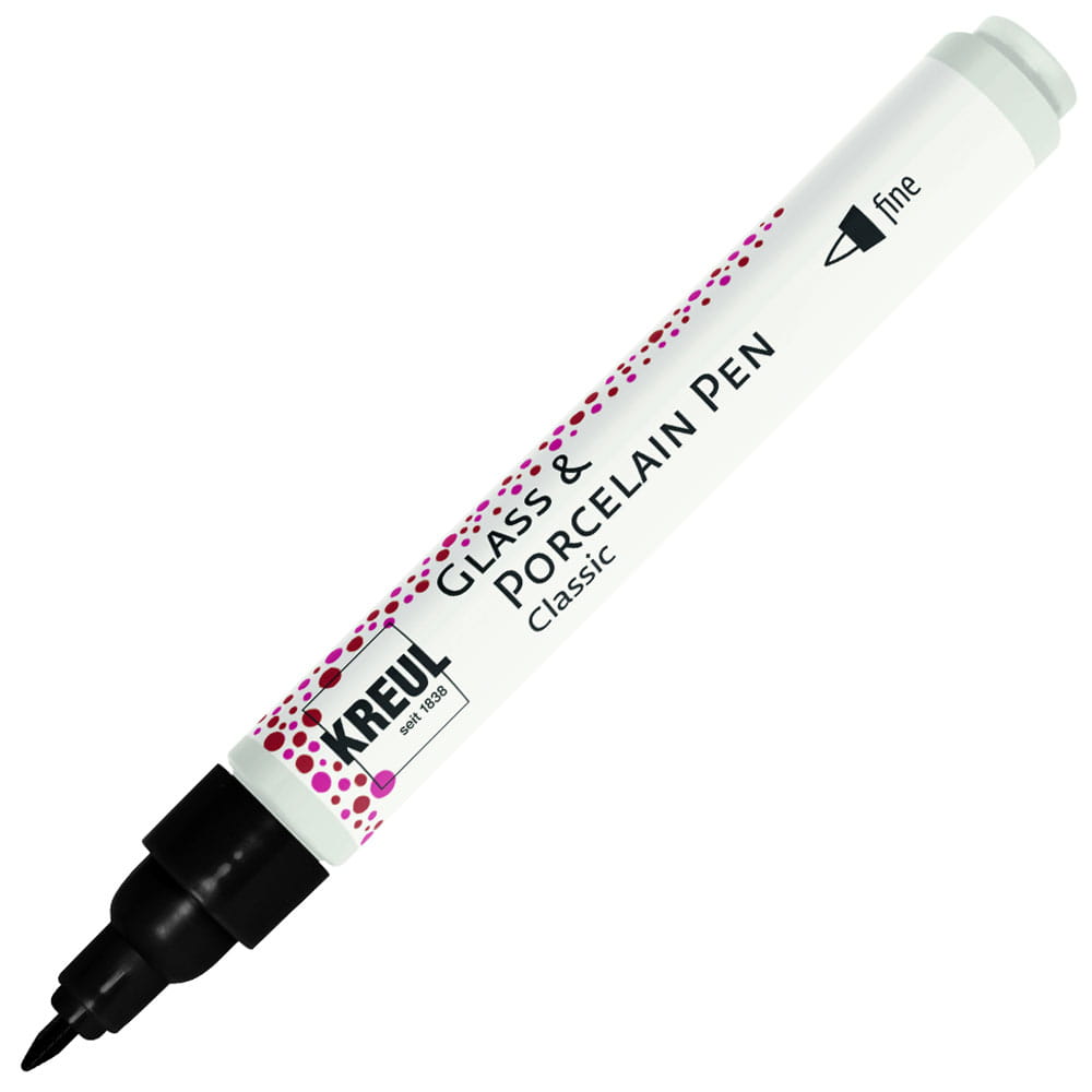 Marker Glas and Porcelain Pen marki Kreul - pisak niemieckiej firmy do porcelany i szkła Posiada okrągłą końcówkę, pozwalającą uzyskać linie o szer. 1-2 mm. Zawiera wodną farbę, odporną na światło, o dobrej sile krycia. Można stosować na: porcelanie, szkle, szkliwionej ceramice, metalu.