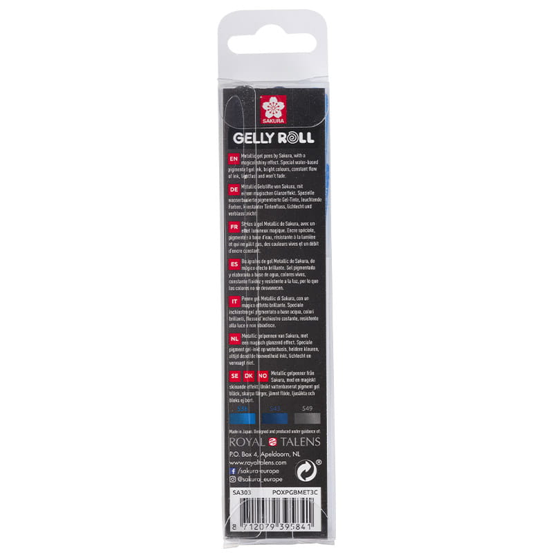 Gelly Roll marki Sakura serii metallic, charakteryzuje się błyszczącymi kolorami. Tusz na bazie wody, który po wyschnięciu nie rozmazuje się i jest wodoodporny. Specjalna technologia zastosowana w tuszu zapewnia płynne pisanie bez docisku, umożliwia tworzenie równych linii podczas pracy oraz zapewnia stały przepływ atramentu. Idealne do stosowania na papierze białym, kolorowym i czarnym.