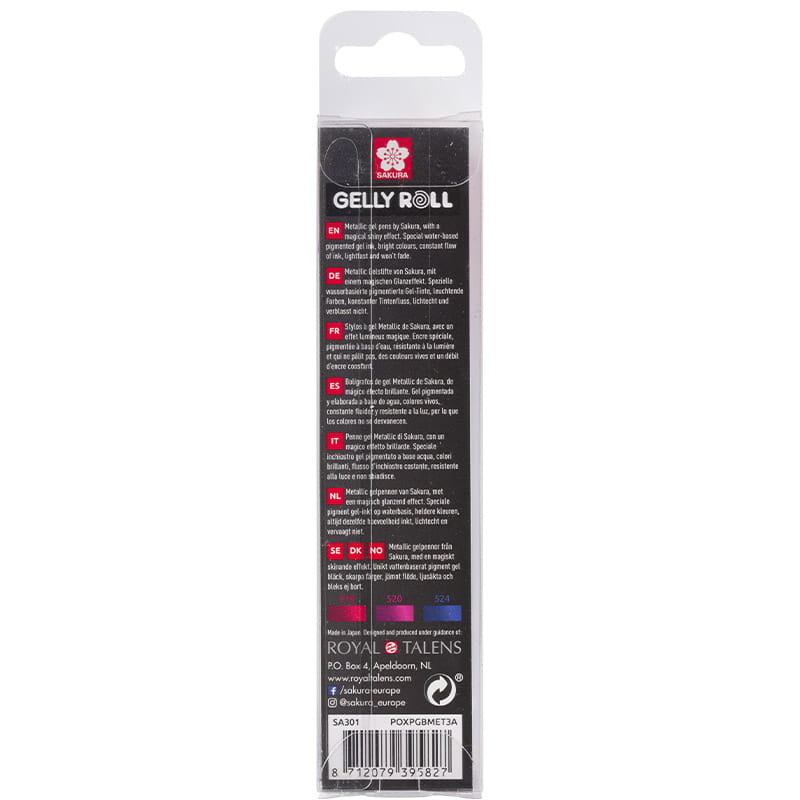 Gelly Roll marki Sakura serii metallic, charakteryzuje się błyszczącymi kolorami. Tusz na bazie wody, który po wyschnięciu nie rozmazuje się i jest wodoodporny. Specjalna technologia zastosowana w tuszu zapewnia płynne pisanie bez docisku, umożliwia tworzenie równych linii podczas pracy oraz zapewnia stały przepływ atramentu. Idealne do stosowania na papierze białym, kolorowym i czarnym.
