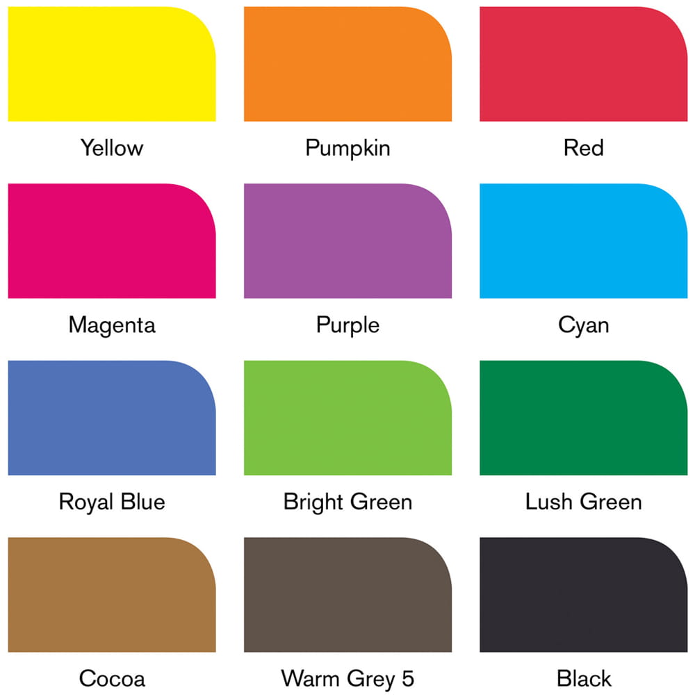 Kolory w zestawie: Yellow, Pumpkin, Red, Magenta, Purple, Cyan, Royal Blue, Bright Green, Lush Green, Cocoa, Warm Grey 5, Black.