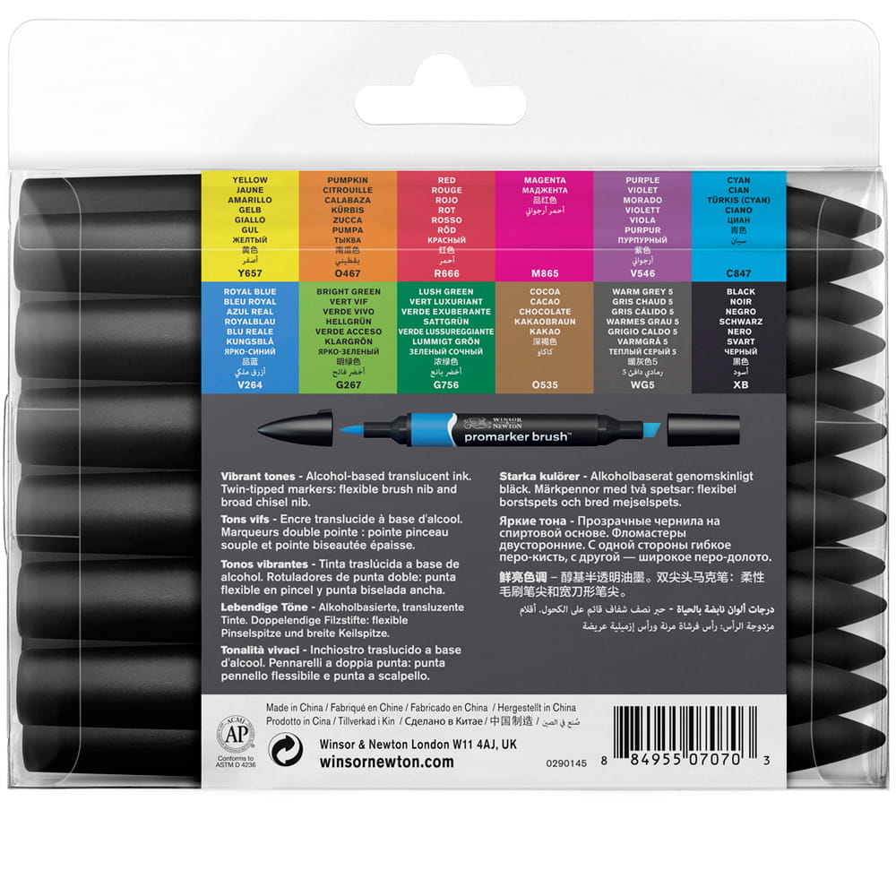 Promarkery Brush to pisaki wyposażone w dwa rodzaje końcówek płaską oraz pędzelkową. Praca z tym narzędziem daje maksimum możliwości, ekspresję oraz kontrolę nad linią. Najwyższa jakość końcówek i tuszu zapewnia nieskazitelny kolor, który rozprowadza się niezwykle gładko i jednolicie, bez nieestetycznych smug. Zastosowano szybkoschnący, nietoksyczny, trwały tusz na bazie alkoholu. Markery Promarker Brush są dostępne w palecie 71 kolorów oraz blendera