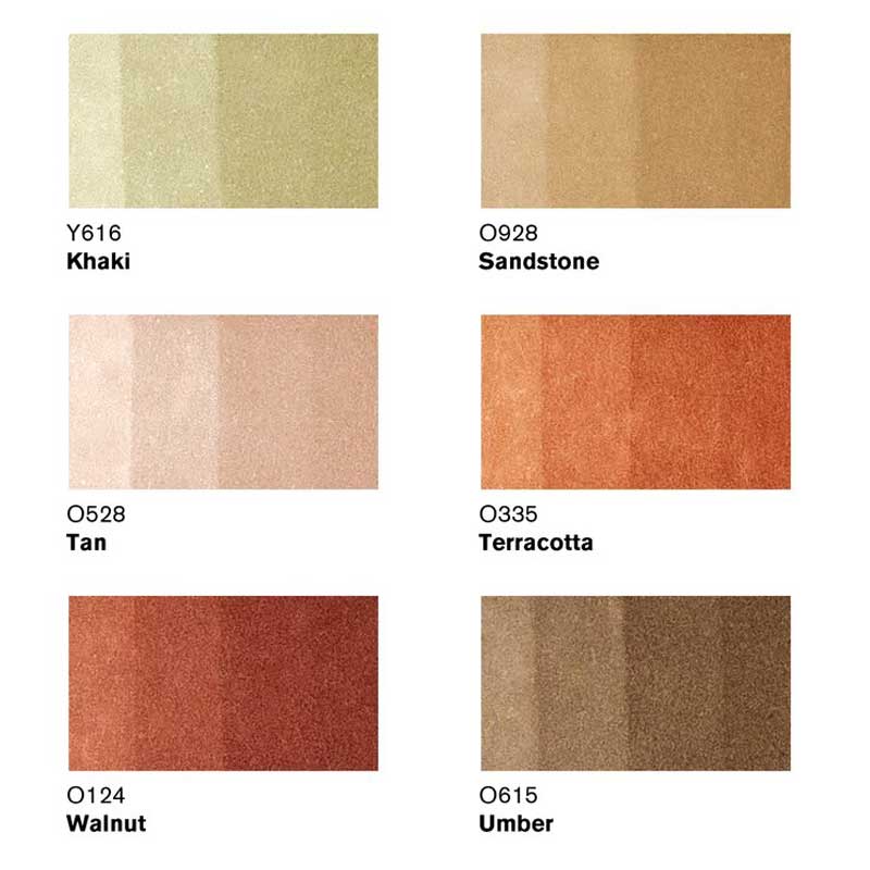 Khaki, Sandstone, Tan, Terracotta, Walnut, Umber.