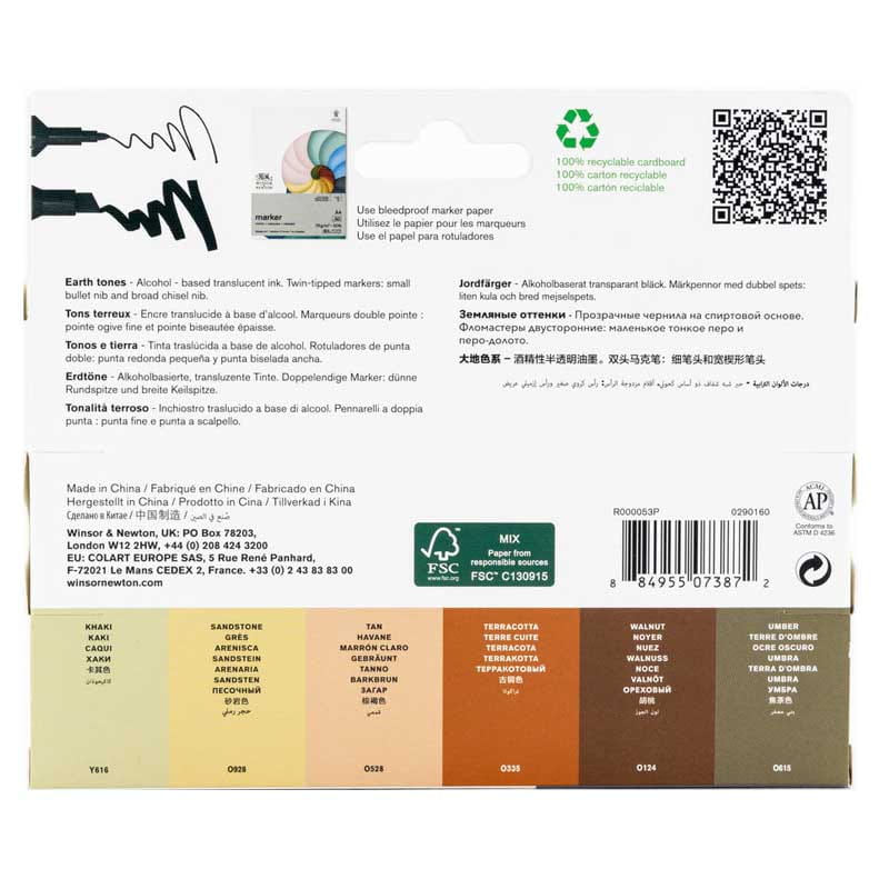 Promarkery Winsor & Newton posiadają szeroką gamę 188 kolorów, od intensywnych i nasyconych do najsubtelniejszych odcieni pastelowych. Najwyższa jakość końcówek i tuszu zapewnia nieskazitelny kolor, który rozprowadza się niezwykle gładko i jednolicie, bez nieestetycznych smug. Zastosowano szybkoschnący, nietoksyczny, trwały tusz na bazie alkoholu. Komplet zawiera 6 kolorów inspirowanych naturą w odcieniach ziemi. Markery zostały specjalnie do siebie dobrane, aby uzyskać najlepsze efekty.