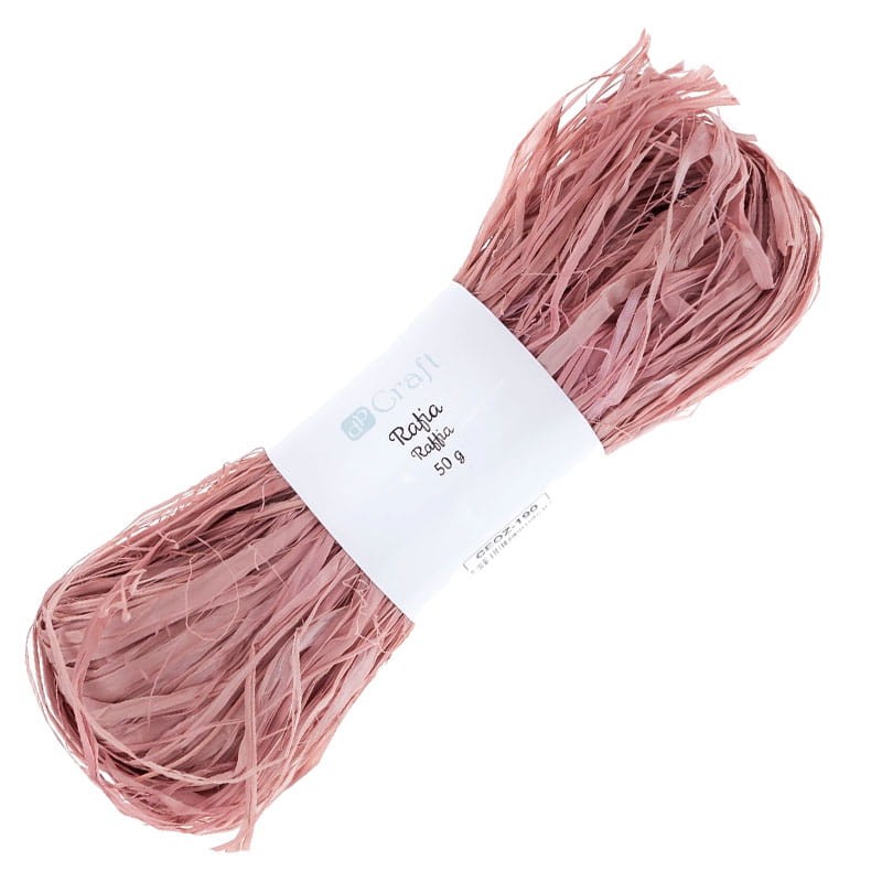 Rafia w kolorze zgaszonego różu, pozyskiwana jest z naturalnych włókien roślinnych. Można ją wykorzystać do pakowania prezentów, jako ozdoba czy również do własnoręcznego tworzenia akcesoriów np. bransoletek, breloków i kolczyków. Prezentować może się bardzo dobrze przy projektach home decor w stylu boho.