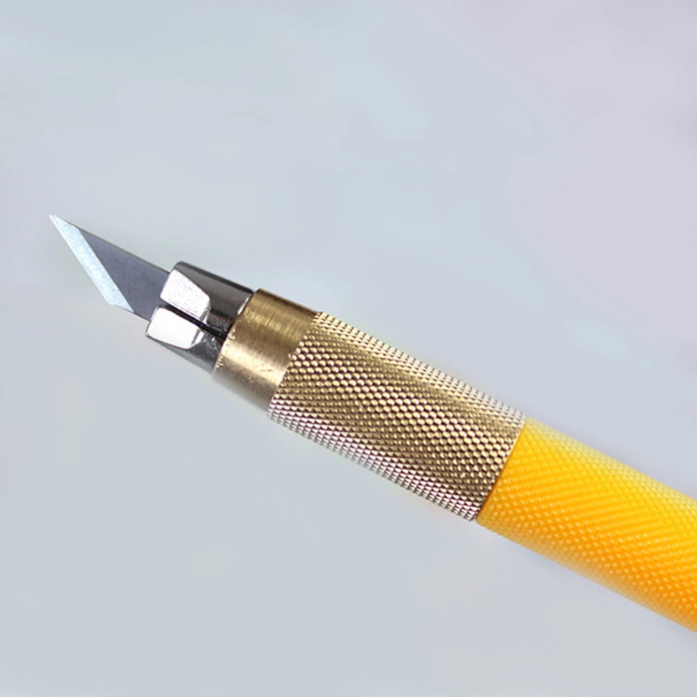 Nóż do precyzyjnego cięcia papieru, foli, kartonu. Posiada wydłużoną rękojeść, której koniec ma formę wygodnej szpatułki przydatnej np. do dociskania lub formowania drobnych elementów.
