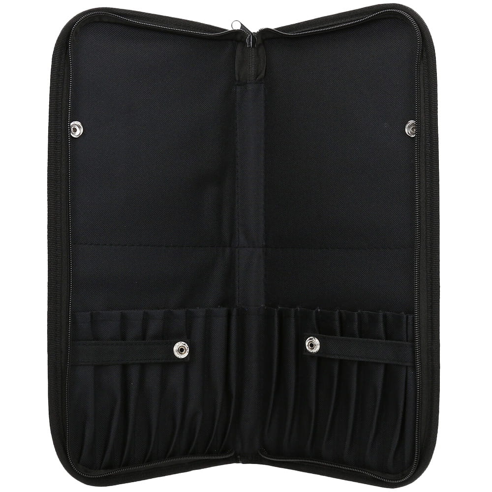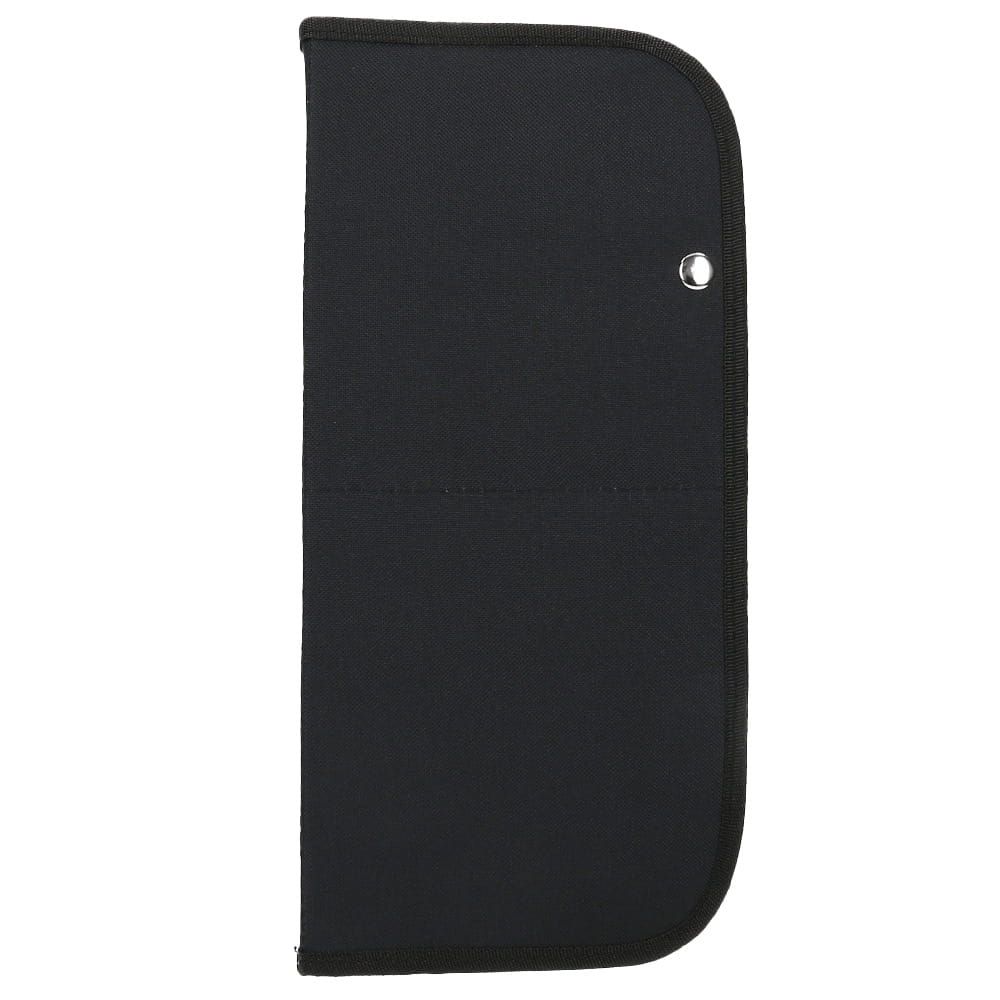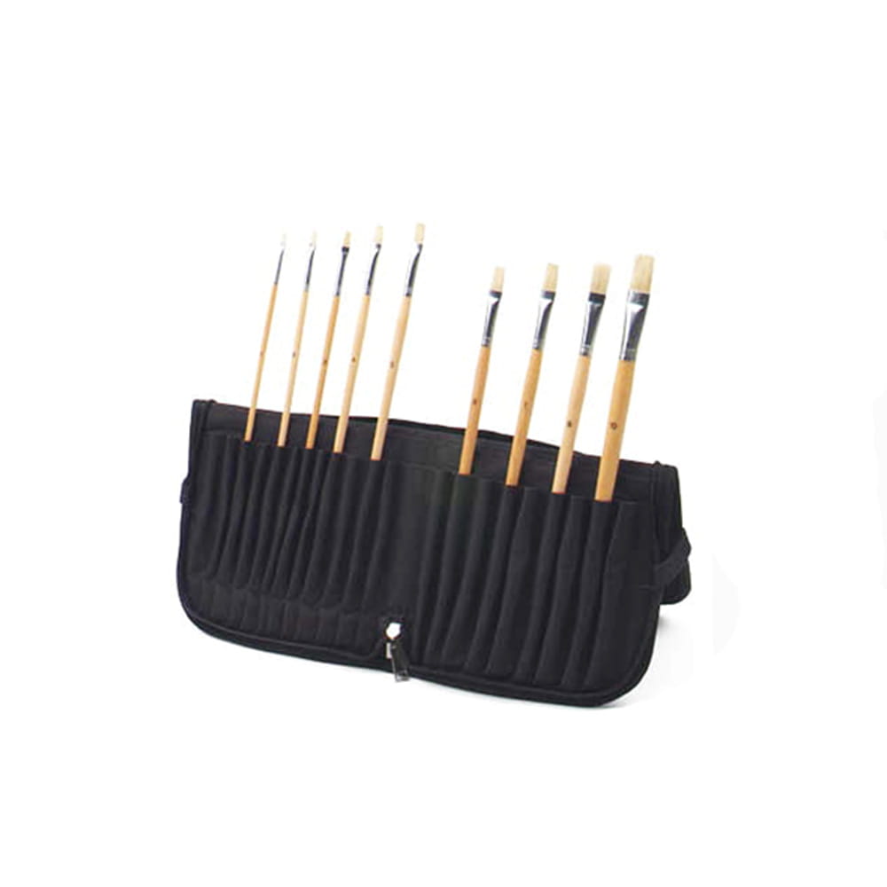 Stojący piórnik z materiału. Piórnik jest usztywniany, zapinany na zamek błyskawiczny i dodatkowo łamany tak aby można było go postawić. Format 19x38 cm. Kolor czarny. Idealny jako organizator i miejsce do przechowywania pędzli. Oprócz pędzli można trzymać również ołówki, kredki i inne podłużne przybory.