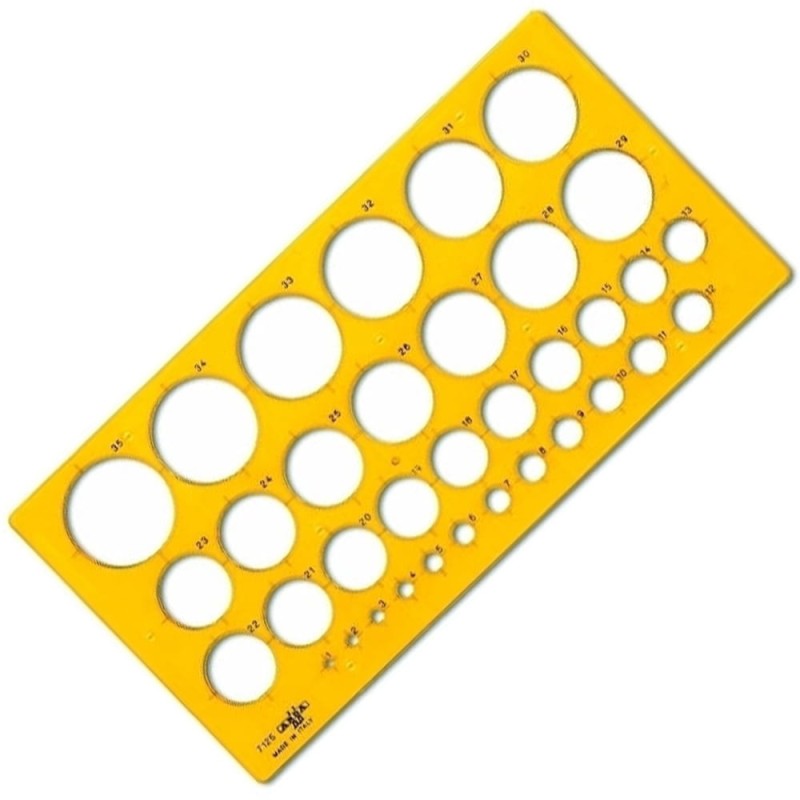 Szablon kół wykonany z trwałego, transparentnego tworzywa sztucznego. Pozwala na wykreślanie wzorów kół o różnych rozmiarach. Zaznaczone osie izometryczne. Krawędzie przystosowane do kreślenia tuszem i cienkopisami technicznymi. Posiada nieścieralną podziałkę oraz zaokrąglone krawędzie dla bezpieczeństwa użytkownika.