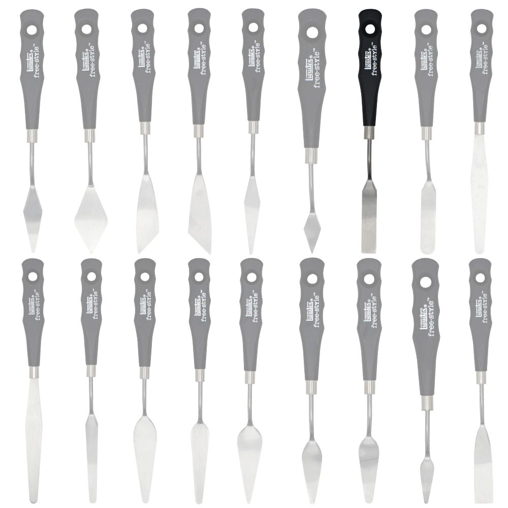 Duże szpachelki malarskie o oryginalnych kształtach. Doskonałe do mieszania i nakładania farb oraz mediów. Sprawdzą się podczas kształtowania powierzchni przy użyciu past i żeli strukturalnych. Ostrza wykonane z wytrzymałej stali szlachetnej. Szpachelki cechują się solidnym wykonaniem i elastycznością. Dzięki profilowanemu uchwytowi praca jest wygodna. Możesz tworzyć nowe efekty bez trudu i z wyjątkową starannością.