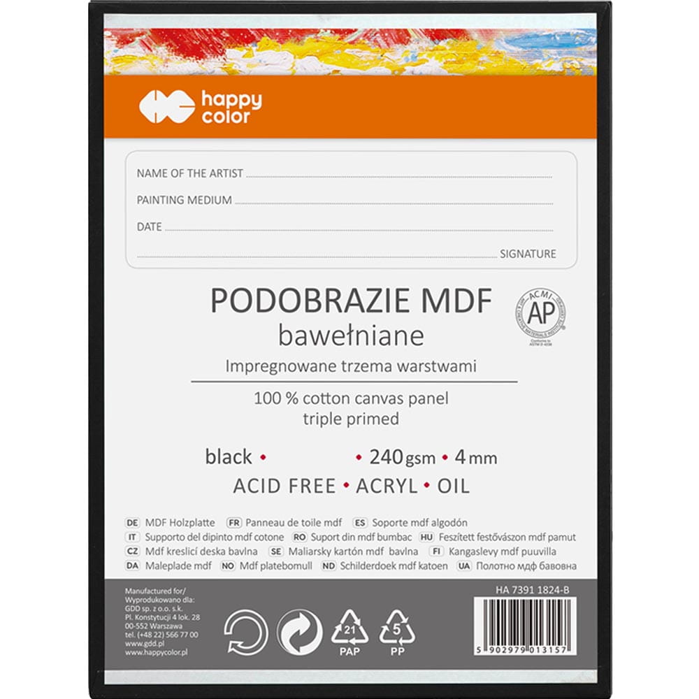Tablica malarska Happy Color to płyta MDF o grubości 4 mm pokryta barwionym na czarno, bawełnianym płótnem zaimpregnowanym bezbarwnym lakierem podkładowym (nie żelatyną). Użyta w produkcie bawełna jest wolna od kwasów wybielających, natomiast płyta MDF została zabezpieczona przed naciąganiem wilgoci.