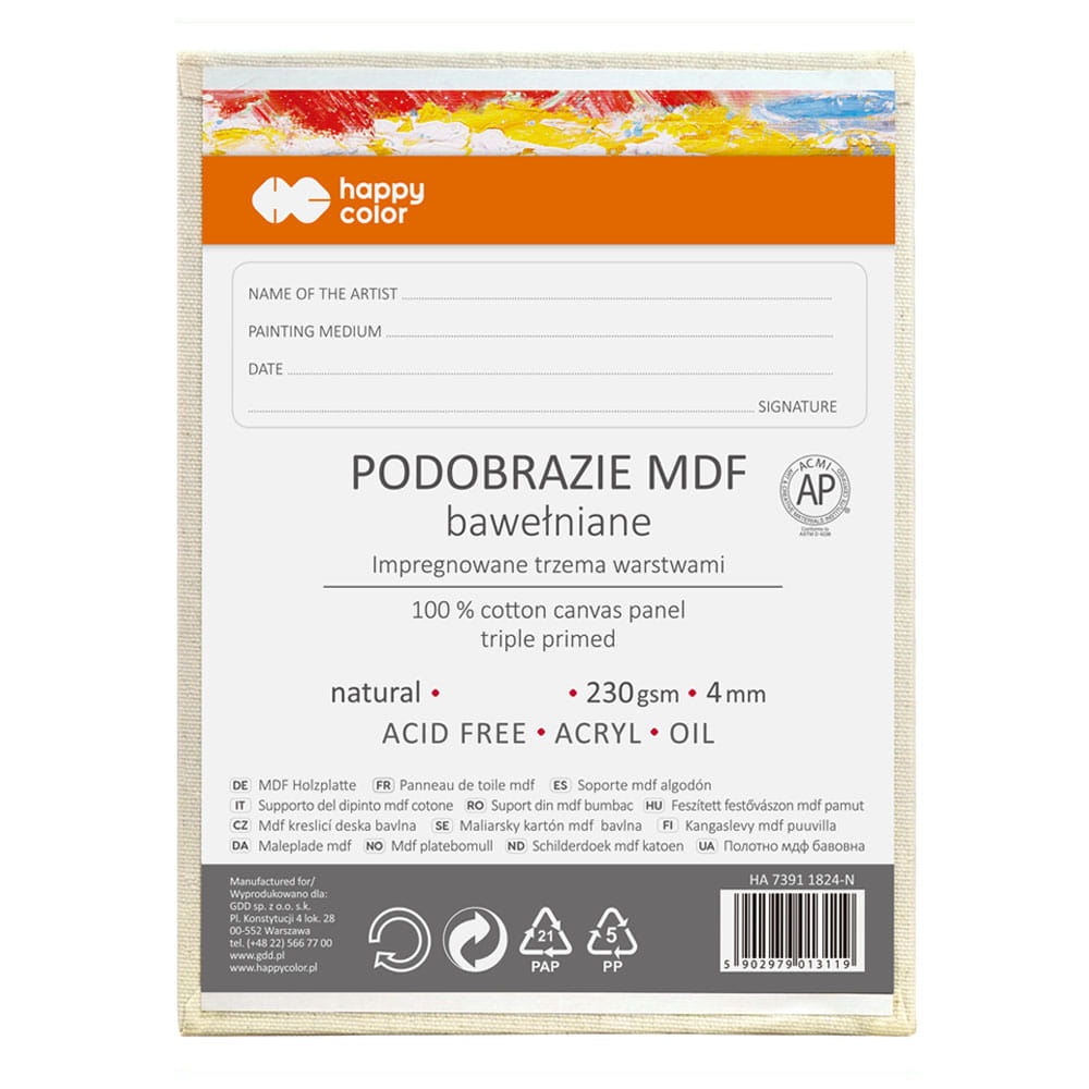 Tablica malarska Happy Color to płyta MDF o grubości 4 mm pokryta naturalnym, bawełnianym płótnem zaimpregnowanym bezbarwnym lakierem podkładowym (nie żelatyną). Użyta w produkcie bawełna jest wolna od kwasów wybielających, natomiast płyta MDF została zabezpieczona przed naciąganiem wilgoci.