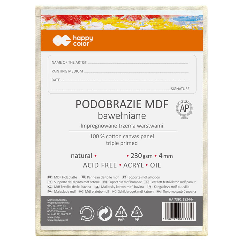 Tablica malarska Happy Color to płyta MDF o grubości 4 mm pokryta naturalnym, bawełnianym płótnem zaimpregnowanym bezbarwnym lakierem podkładowym (nie żelatyną). Użyta w produkcie bawełna jest wolna od kwasów wybielających, natomiast płyta MDF została zabezpieczona przed naciąganiem wilgoci.
