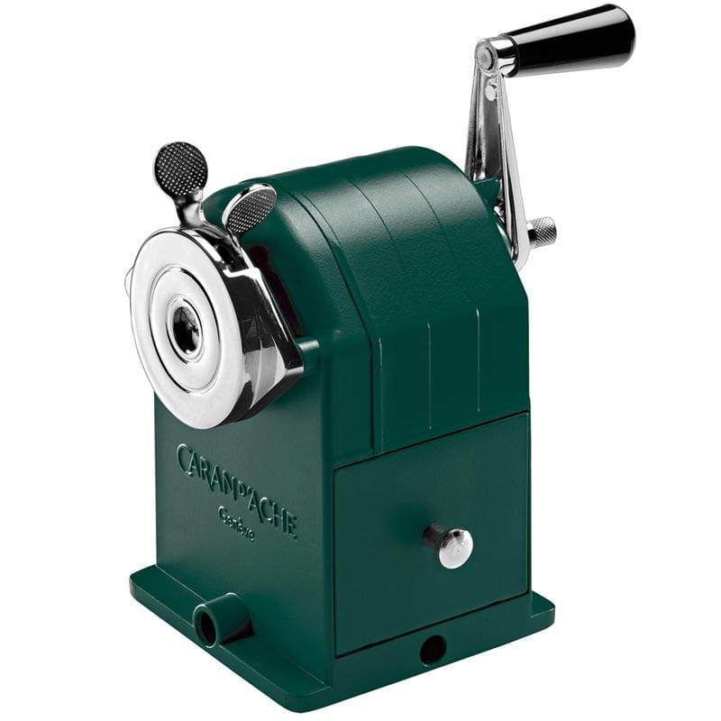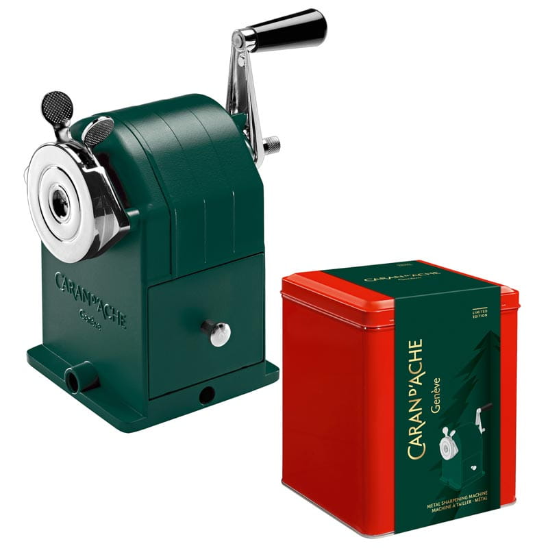 Legendarna temperówka na korbkę w kolorze ciemnej sosnowej zieleni jest odzwierciedleniem zaangażowania w wyjątkową jakość i precyzję. Jest połączeniem funkcjonalności i designu. Metalowa temperówka na korbkę z wysuwaną szufladką. Do temperówki dołączone jest imadło, którym możemy przymocować ją na stałe do blatu stołu czy biurka. Wyposażona jest w mechanizm regulacji głębokości ostrza. Niezwykle precyzyjna i funkcjonalna. Pozwala temperować ołówki/kredki o średnicy od 4 do 10 mm. Temperówka umieszczona w eleganckiej metalowej puszce.