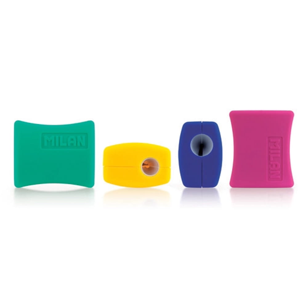 Temperówka podwójna DOUBLE Milan z satynową, jedwabistą powłoką, w dotyku jak gumka. Temperówka na cienkie lub grube ołówki i kredki, z pojemnikiem na ścinki. Bezpieczne ostrze ze stali węglowej. Idealna do piórnika.