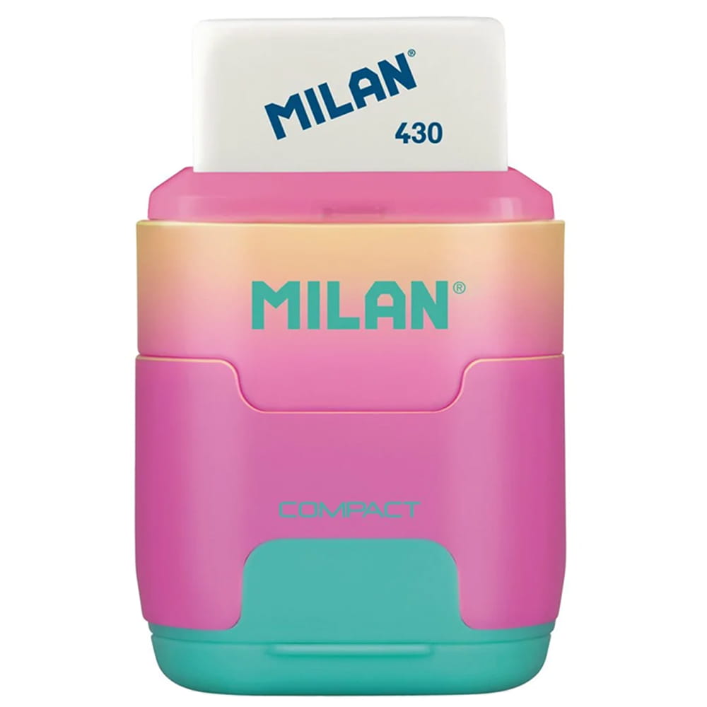 Temperówko-gumka. Z jednej strony podwójna temperówka na cienkie i grube kredki i ołówki, z drugiej miękka gumka syntetyczna. Wyposażona w pojemniczek na ścinki. Temperówka ma ostre i wytrzymałe stalowe ostrze, a jednocześnie bezpieczne dla dziecka. Nadaje się do wszystkich rodzajów ołówków. Obudowa występuje w czterech wersjach kolorystycznych. Można wymienić gumkę, pasuje do niej: Milan 430.