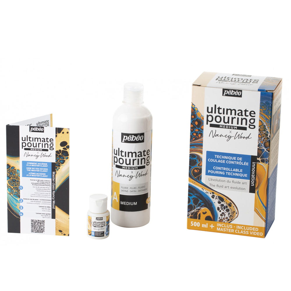 Zestaw do pouringu powstał przy współpracy Pebeo z Nancy Wood. Składa się z 2 składników: medium na bazie wody oraz katalizatora, które łączy się w odpowiednich proporcjach z farbami akrylowymi.