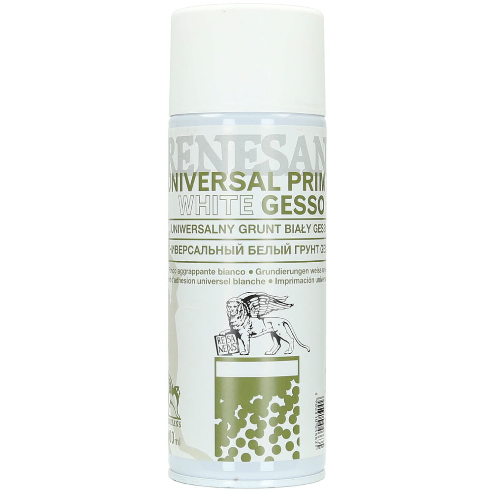Gesso uniwersalne białe w sprayu służy do gruntowania i przygotowywania większości wewnętrznych i zewnętrznych powierzchni. Grunt blokuje absorpcję powierzchni i tworzy jednolitą warstwę ochronną, poprawia przyczepność i wzmacnia kolor końcowej farby. Szybko wysycha, ma dobrą przyczepność oraz wypełnianie. Jest odporny na światło słoneczne i warunki atmosferyczne. Cechuje je również duża wydajność. Nie posiada pigmentów zawierających metale ciężkie oraz gazy kwalifikowane jako szkodliwe dla ozonu. Można zdjąć acetonem lub rozpuszczalnikiem.