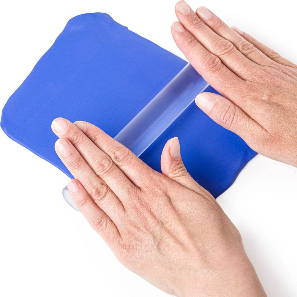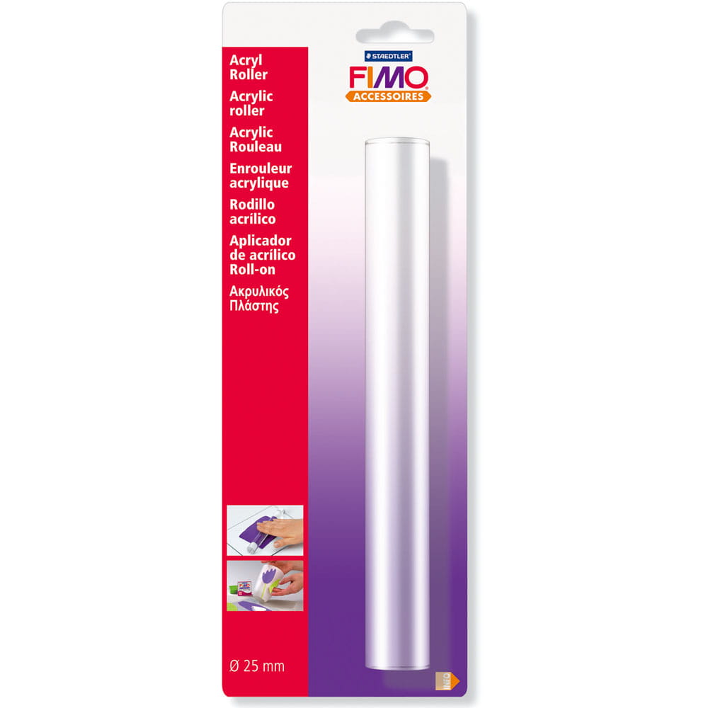 Roller akrylowy służy do wałkowania mas plastycznych FIMO i wygładzania ich powierzchni. Nie przywierają one do narzędzia, a duże rozmiary (20 cm długości, 25 mm średnicy) sprawiają, że praca przebiega komfortowo i szybko. Rozwałkowana masa posłużyć może np. do wycinania kształtów z użyciem foremek.