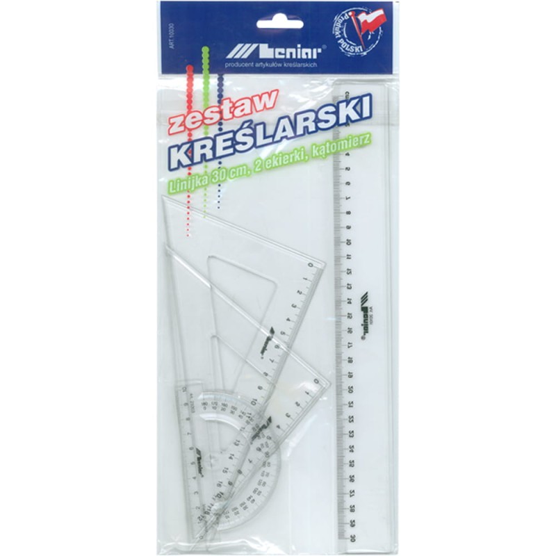 Zestaw 4-elementowy LENIAR to niezbędny element wyposażenia każdego ucznia i studenta. Idealnie sprawdzi się na lekcjach matematyki, zajęciach plastycznych czy technicznych. Przybory wykonane z trwałego, transparentnego tworzywa, niepodatnego na uszkodzenia. Opakowanie foliowe.
