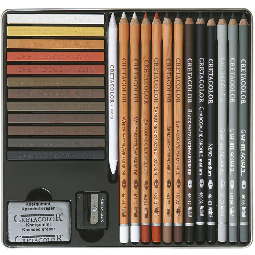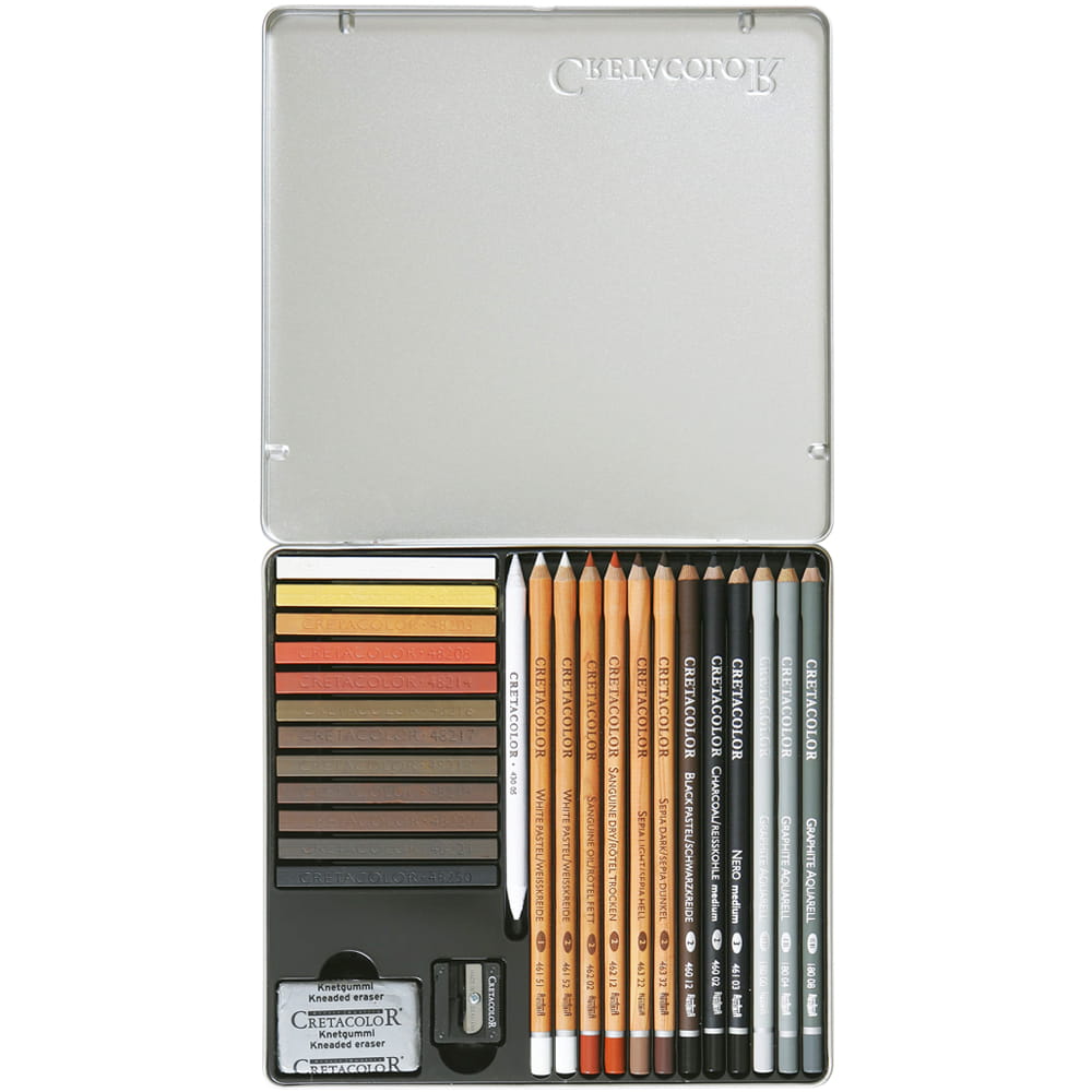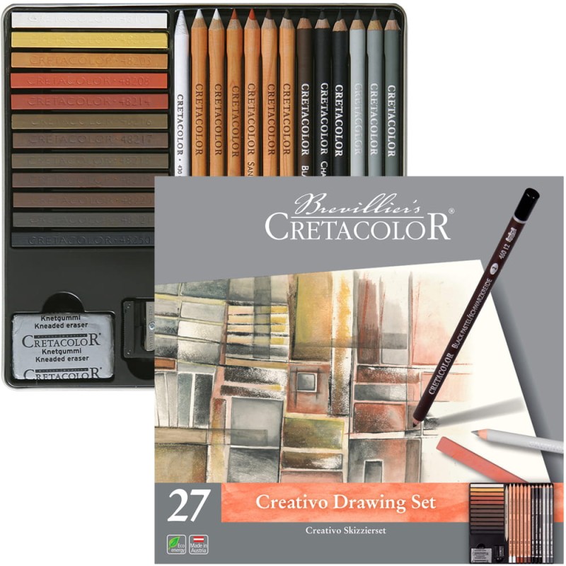 Komplet Creativo Cretacolor zawiera 27 elementów do prac rysunkowych. Pozwala rozwijać kreatywność, łącząc różne techniki rysunku. w sepii, czerni i graficie. Zestaw zawiera pastele w sztyfcie, sepie i węgle w kredce oraz ołówki akwarelowe. Całość zamknięta jest w solidnym metalowym opakowaniu. Elegancki zestaw świetnie nadający się na prezent dla każdego kto uwielbia szkicować - zarówno amatora, jak i profesjonalisty.