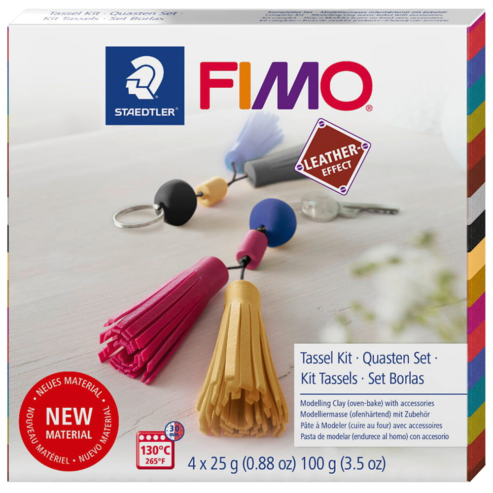 Zestaw Fimo Leather Effect Tassel Kit ma w sobie wszystko, co potrzebne do stworzenia oryginalnych breloczków.