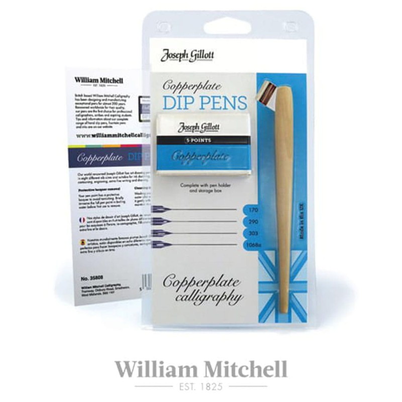 Zestaw firmy William Mitchell zawiera 4 stalówki Joseph Gillott: 170, 290, 303,1068a oraz drewnianą obsadkę typu Copperplate do pisma pochyłego - skośnego, umożliwiające pisanie pod kotem 55 stopni.