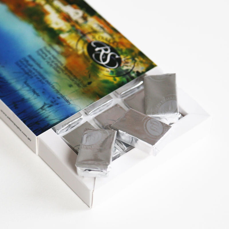 Etykiety na kostkach akwareli wykonane są z papieru akwarelowego pomalowanego ręcznie oryginalną farbą. Opakowanie zawiera informacje dotyczące światłotrwałości, granulacji i transparentności.