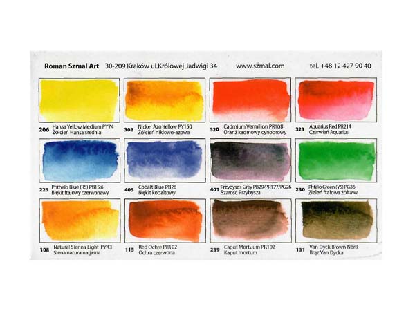 Zestaw 12 kolorów wybrany z palety 140 farb AQUARIUS przez Artura Przybysza - lubelskiego artystę.