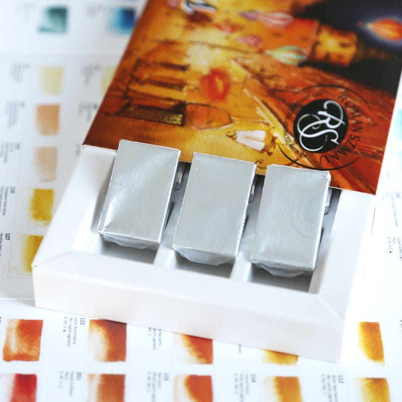 Etykiety na kostkach akwareli wykonane są z papieru akwarelowego pomalowanego ręcznie oryginalną farbą. Opakowanie zawiera informacje dotyczące światłotrwałości, granulacji i transparentności.