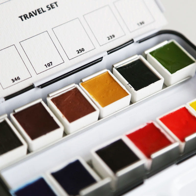 Komplet 12 półkostek umieszczonych w bardzo funkcjonalnej metalowej kasetce, która po rozłożeniu staje się jednocześnie paletą do mieszania kolorów. W zestawie znajdują się najbardziej niezbędne kolory, które pozwalają na uzyskanie wielu indywidualnych odcieni. Kasetka zajmuje na tyle mało miejsca, że można zawsze mieć ją przy sobie by w razie potrzeby, w każdej sytuacji przystąpić do utrwalenia tego co w danej chwili inspiruje.