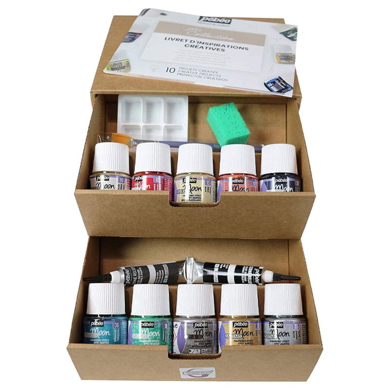 Całość zamknięta jest w ekologicznym, kartonowym pudełku z wygodnymi szufladkami, ułatwiające przechowywanie farb i akcesoriów.
