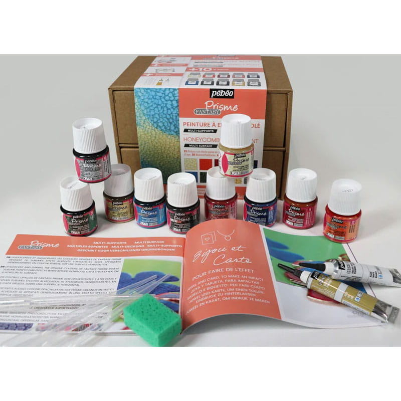 Zestaw farb Fantasy Prisme marki Pébéo to innowacyjne farby alkidowe. Tworzą one niepowtarzalny efekt plastra miodu. Sposób ich nakładania ogranicza tylko nasza wyobraźnia; mogą być nakładane punktowo za pomocą pipety, rozlewane prosto ze słoiczka. Idealnie nadają się do technik mieszanych z innymi farbami Pebeo.