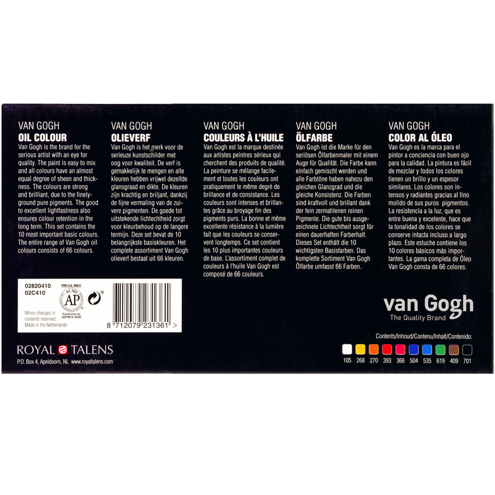 Farby olejne Van Gogh są idealne dla artystów, którzy cenią sobie wysoką jakość farby. W swojej klasie reprezentują najlepszy stosunek jakości do ceny, zapewniony przez renomowaną firmą Royal Talens. Zawierają wysoki poziom pigmentu, a kolory są mocne i intensywne.