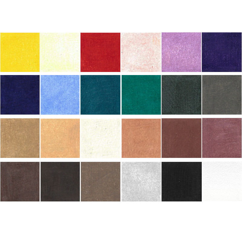 Sun Yellow, Scarlet, Salmon, Violet, Mid Ultramarine, Mallard Green, Brown Ochre, Yellow Ochre, Sandstone, Natural Brown, Black, White, Champagne, Heather, Blue Violet, Dark Turquoise, Racing Green, Seaweed, Wheat, Venetian Red, Ruby Earth, Chocolate, Van Dyke Brown and Mist