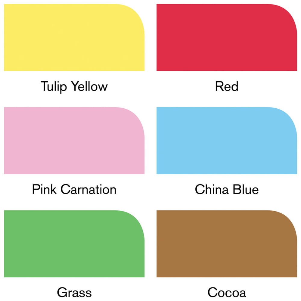 Kolory w zestawie: Tulip Yellow, Red, Pink Carnation, China Blue, Grass, Cocoa.
