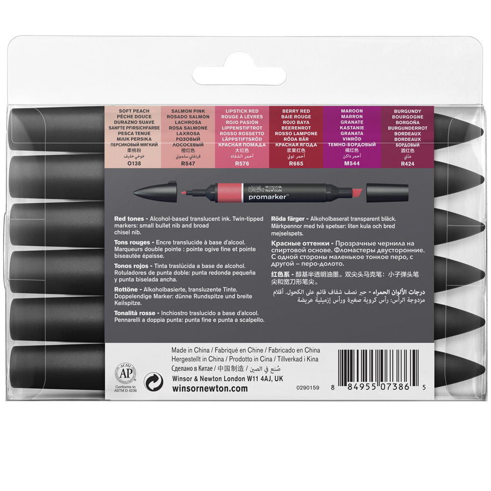 Promarkery Winsor & Newton posiadają szeroką gamę 188 kolorów, od intensywnych i nasyconych do najsubtelniejszych odcieni pastelowych. Najwyższa jakość końcówek i tuszu zapewnia nieskazitelny kolor, który rozprowadza się niezwykle gładko i jednolicie, bez nieestetycznych smug. Zastosowano szybkoschnący, nietoksyczny, trwały tusz na bazie alkoholu. Komplet zawiera 6 markerów w odcianiach czerwieni, które zostały specjalnie do siebie dobrane, aby uzyskać najlepsze efekty.