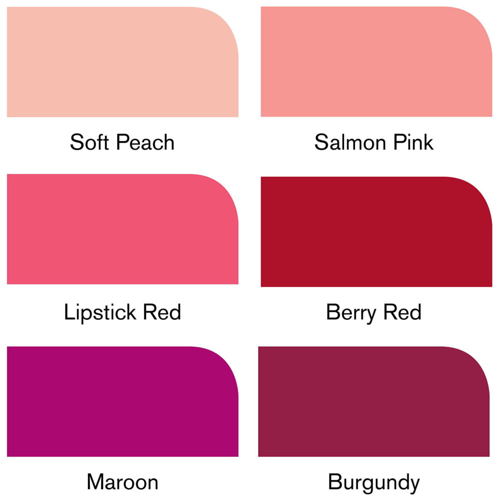 Kolory w zestawie: Soft Peach, Salmon Pink, Lipstick Red, Berry Red, Maroon, Burgundy.
