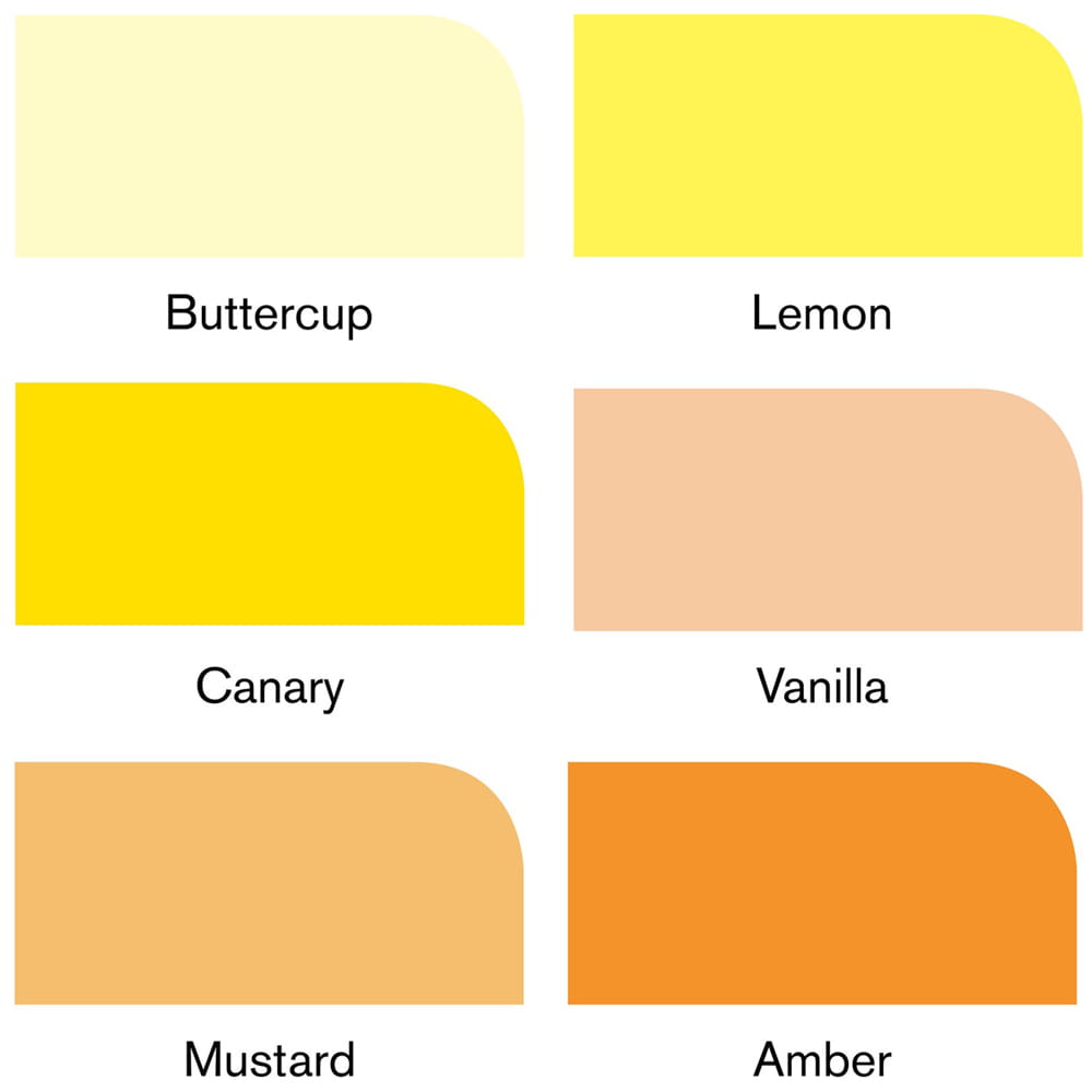 Kolory w zestawie: Buttercup, Lemon, Canary, Vanilla, Mustard, Amber.